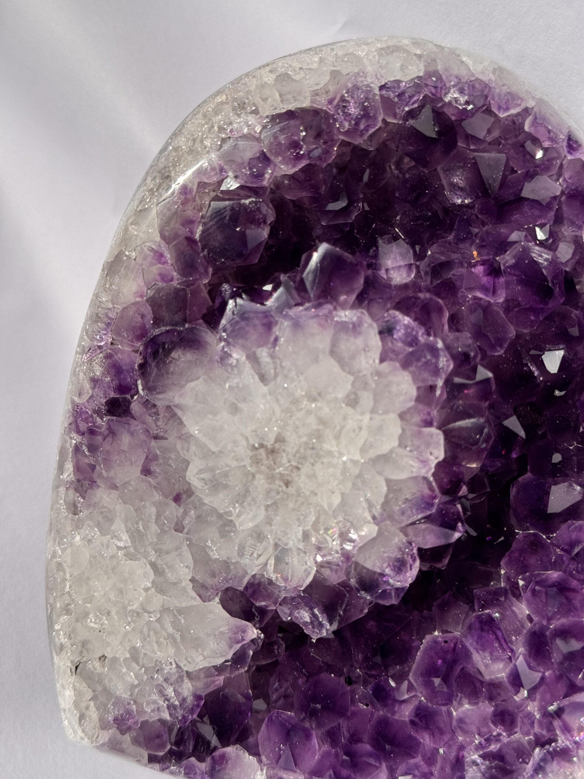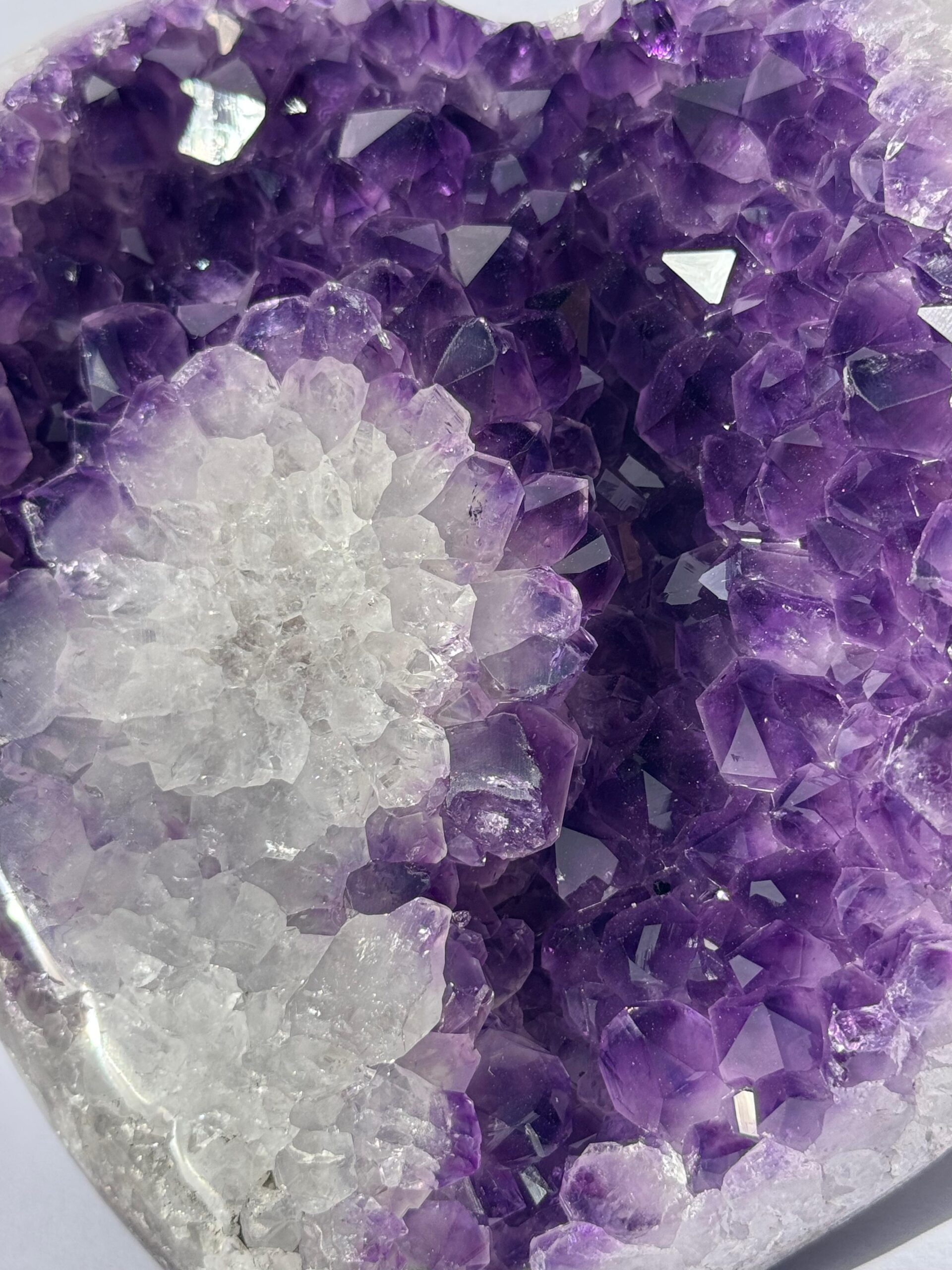 Amatista en forma de corazón que irradia serenidad y equilibrio. Sus cristales, del blanco al violeta profundo, reflejan la elegancia natural del cuarzo y simbolizan claridad mental, calma y conexión espiritual.