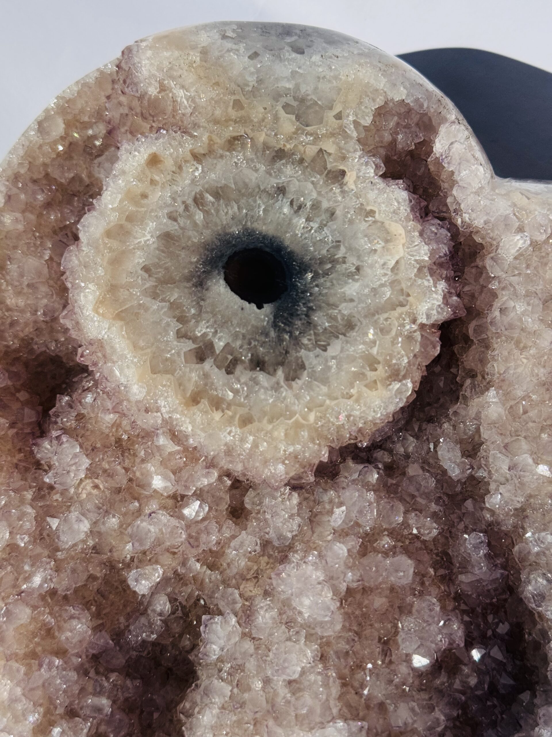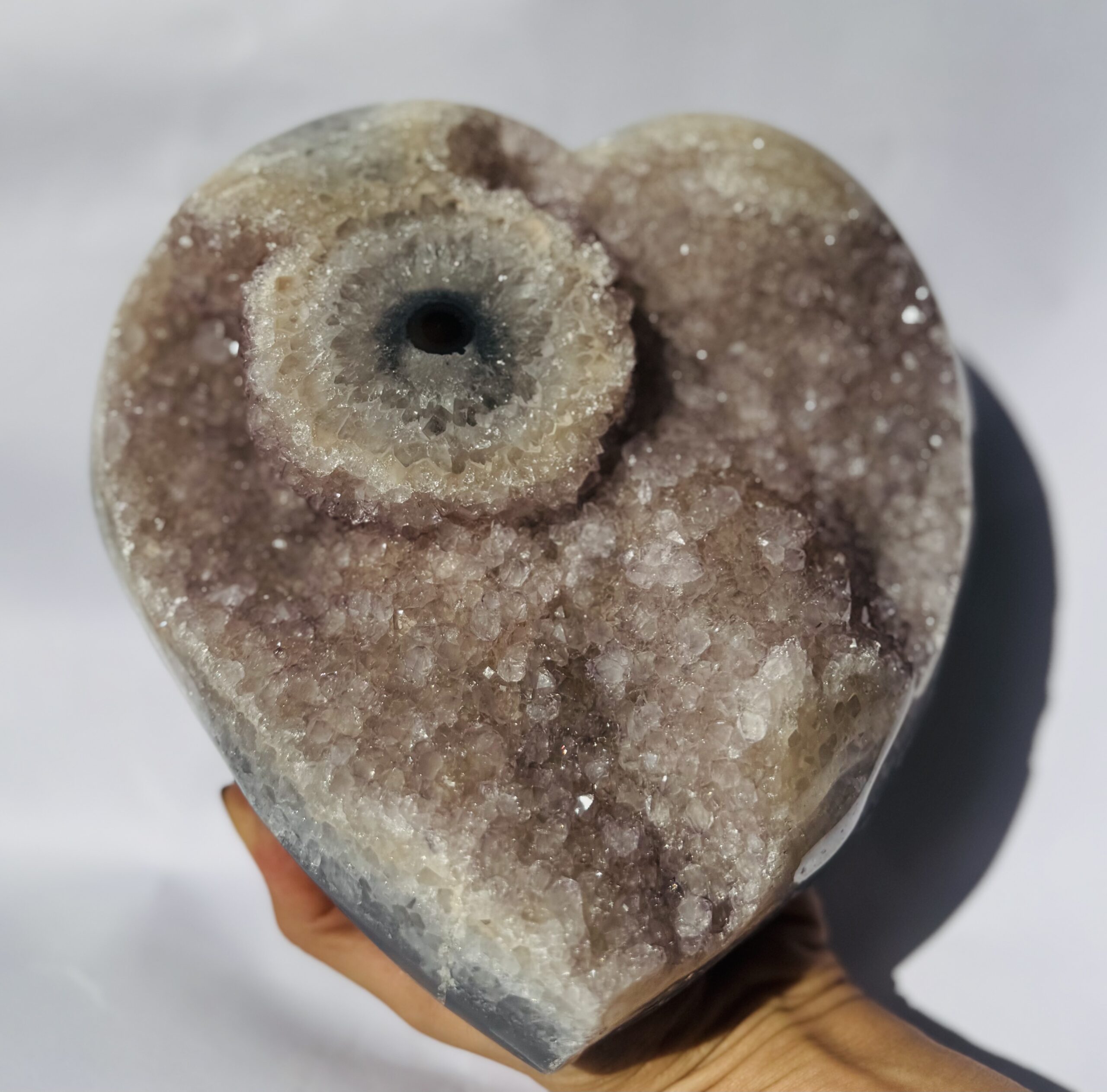 Esta amatista en forma de corazón presenta una fascinante estructura de cristales de cuarzo en tonos rosados y beige. En el centro se observa un “ojo negro”, formado por inclusiones minerales oscuras en la cavidad original de la piedra.